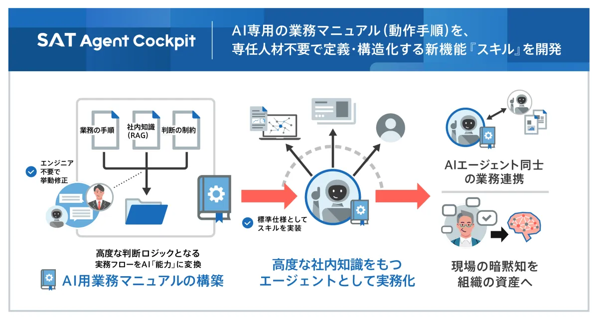 SAT Agent Cockpit(以降SAT AC)に新機能『スキル』を搭載しました。この機能は、既存のドキュメントやAIとの会話を基に、業務マニュアルを半自動的に生成するものです。これにより、複雑なエンジニアリング作業を省き、AIエージェントの能力を素早く引き出すことができます。