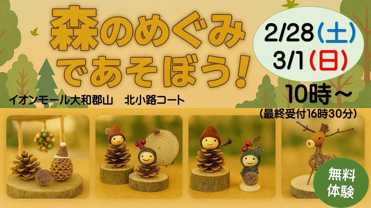 2月28日(土)と3月1日(日)に、イオンモール大和郡山にて、自然素材を使用したネイチャークラフトの無料体験イベントが開催されます。このイベントでは、参加者が木の実や木の枝を使って、オリジナルのクラフト作品を制作できる機会が用意されています。