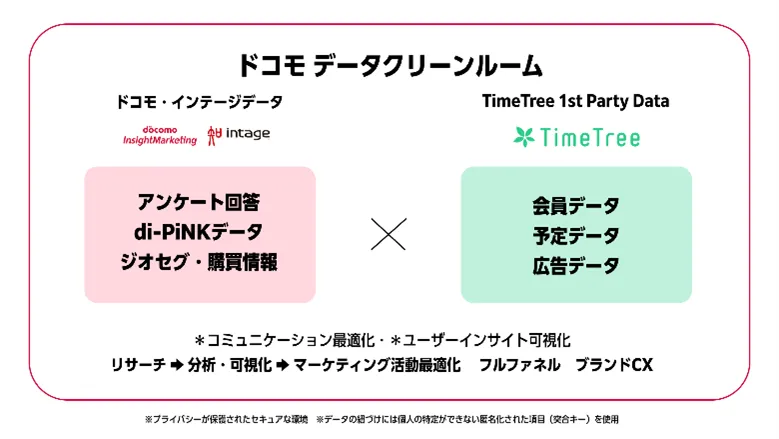 株式会社TimeTree(東京都新宿区)が、株式会社ドコモ・インサイトマーケティング(以下、DIM)および株式会社インテージと協力し、広告配信プラットフォーム「TimeTree Ads」における新たな取り組みを発表しました。これは、DIMが提供する「ドコモ データクリーンルーム」(以下、ドコモ DCR)のデータを活用した新しい広告分析の枠組みです。この連携により、TimeTreeの予定データとドコモ&インテージのデータを効率的に組み合わせることで、より深いユーザーインサイトに基づいた分析が可能になります。
