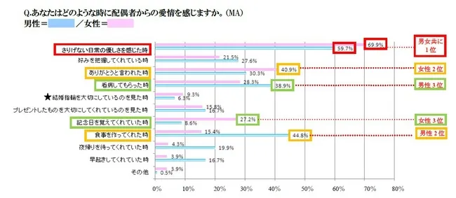 調査では、多くの人が「さりげない日常の優しさ」を愛情を感じる瞬間として挙げており、65.4%がこの回答を選びました。「ありがとうと言われた時」や「看病してもらった時」など、日常の小さな瞬間で愛を感じることが多いことが分かります。特に、男性が「食事を作ってくれた時」に多くの愛情を感じていることが面白い点です。これは「胃袋婚」という言葉が示すように、食事を通じて愛情を象徴する文化が根付いていることを示しています。