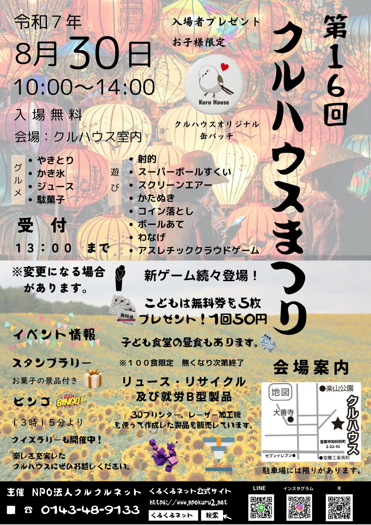 NPO法人くるくるネットが主催する「第16回クルハウスまつり」の開催が決定しました。この恒例イベントは、地域の子どもたちが安心して育ち、居場所を感じられることを目的としています。今回は2025年8月30日(金)に、北海道室蘭市のクルハウスで行われます。
