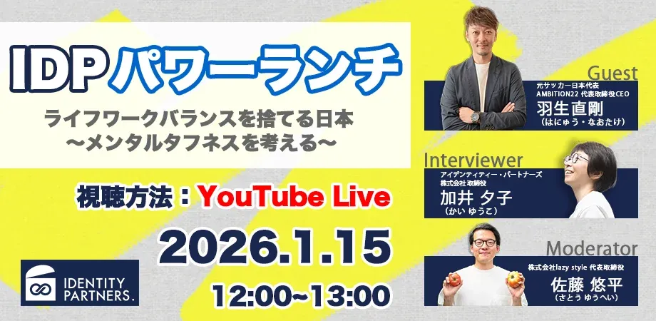 2026年1月15日にアイデンティティー・パートナーズ株式会社が主催するオンライン勉強会「IDPパワーランチ」の初回が開催されました。このセミナーは、日本企業の活性化を目指して、各分野の専門家の生の知見を気軽に学ぶ場として設立されました。今回のテーマは「ライフワークバランスを捨てる日本 ~メンタルタフネスを考える~」で、特別ゲストは元サッカー日本代表選手で「オシムチルドレン」の一人、羽生直剛氏です。