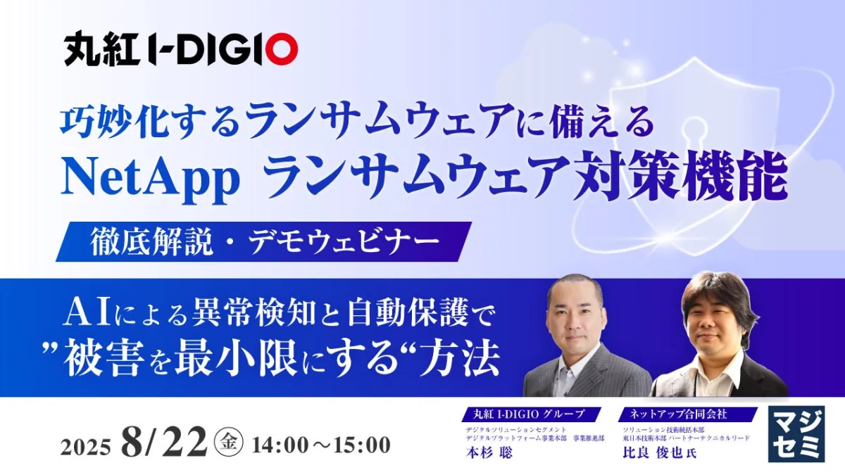 このウェビナーは、丸紅I-DIGIOホールディングス株式会社の主催で、NetApp合同会社、株式会社オープンソース活用研究所、マジセミ株式会社の協力によって実施されます。多くの企業が直面する問題に対して、最新の情報と対策を学ぶ貴重な機会です。