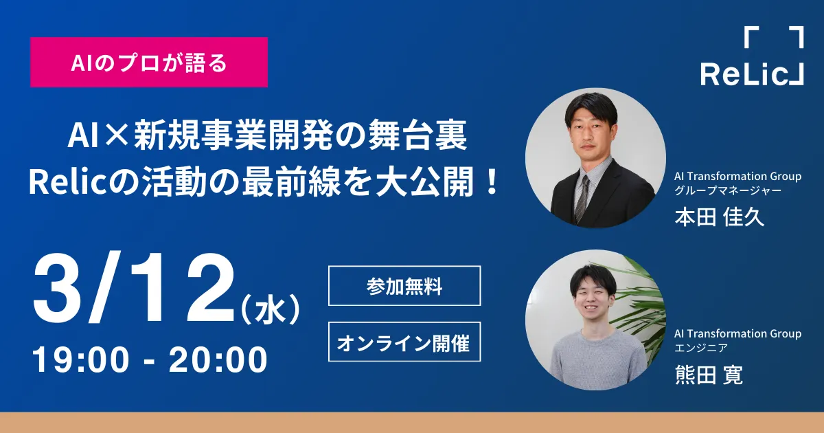 株式会社Relicは、企業の新たな価値創造を目指した事業共創カンパニーとして、AI技術を重視しています。これからのビジネス環境では、AIの活用が非常に重要な鍵となっており、特に新規事業開発やデジタルトランスフォーメーション(DX)の分野でその効果を発揮しています。2025年3月12日(水)19時から行われるウェビナー『AI×新規事業開発の舞台裏—Relicの活動の最前線を大公開!』では、このAI技術を駆使した新たなアプローチや、そこで得られた具体的な成果について詳しく紹介されます。