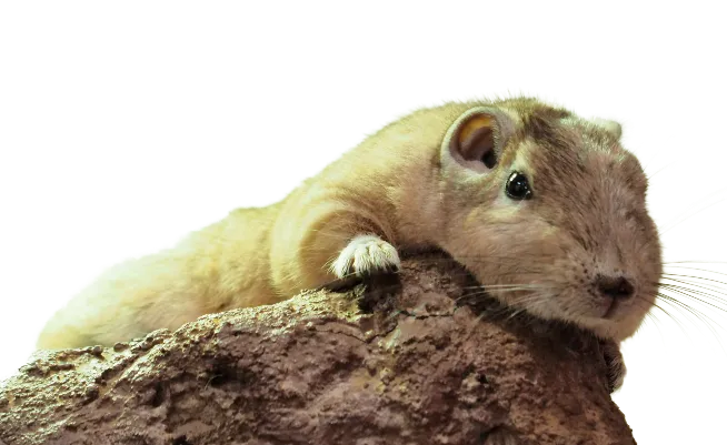 グンディは、砂漠に適応した独特な身体を持っています。耳は岩場での生活においてあまり必要がないため、ほぼ耳介がない状態です。その代わり、大きな後ろ脚には櫛状の剛毛が生えており、岩場に登る時や毛づくろいの際に役立っています。これらの特徴からも、彼らがどれほどその環境に適応しているかが伺えます。