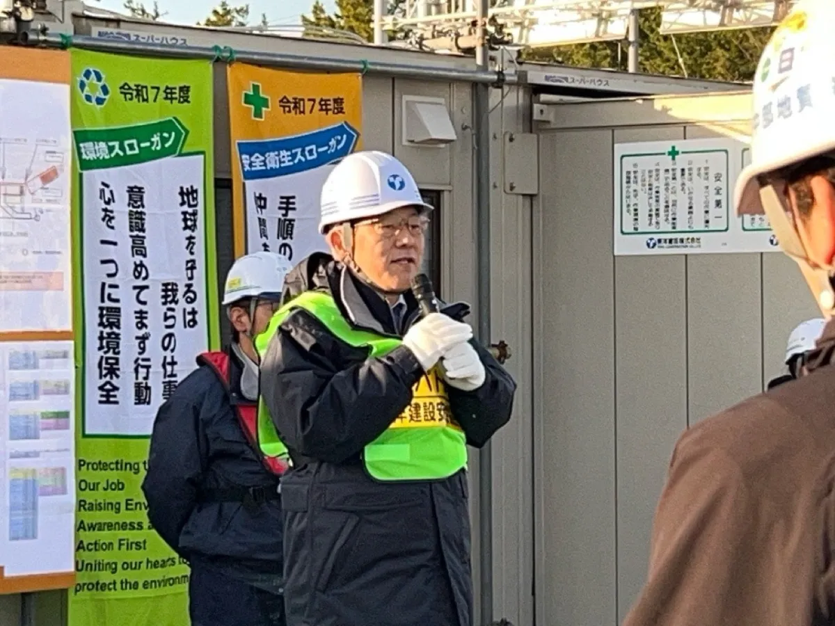 朝礼の場で、中村社長は「この工事は能登での震災に関連する重要な復旧工事です。岸壁の供用中には他の工事や業者との調整が求められ、多くのご苦労をおかけしています。金沢港および能登地域の復興を一日でも早く進めるため、引き続き協力をお願い申し上げます」との挨拶がありました。