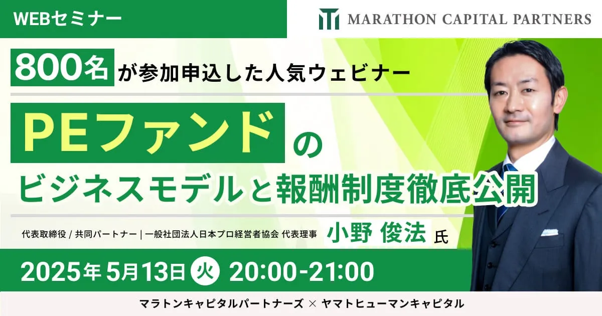 2025年5月13日(火)の20:00から、オンラインにて興味深いウェビナーが行われます。この「PEファンドのビジネスモデルと報酬制度徹底公開」と題されたセミナーでは、マラトンキャピタルパートナーズの小野俊法氏が登壇し、参加者に向けて自らの経験と知見を惜しみなく共有します。