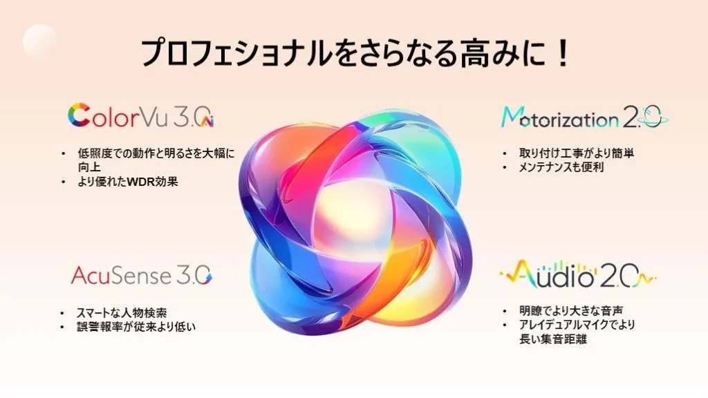 Hikvisionは、私たちの安全を守るための最前線で技術革新に取り組んでいます。今年発表された最新のEasyIP 4.0 Plusセキュリティカメラには、4つの最先端技術であるColorVu 3.0、AcuSense 3.0、Audio 2.0、Motorization 2.0が組み込まれており、よりスマートで安全な未来を実現しています。
