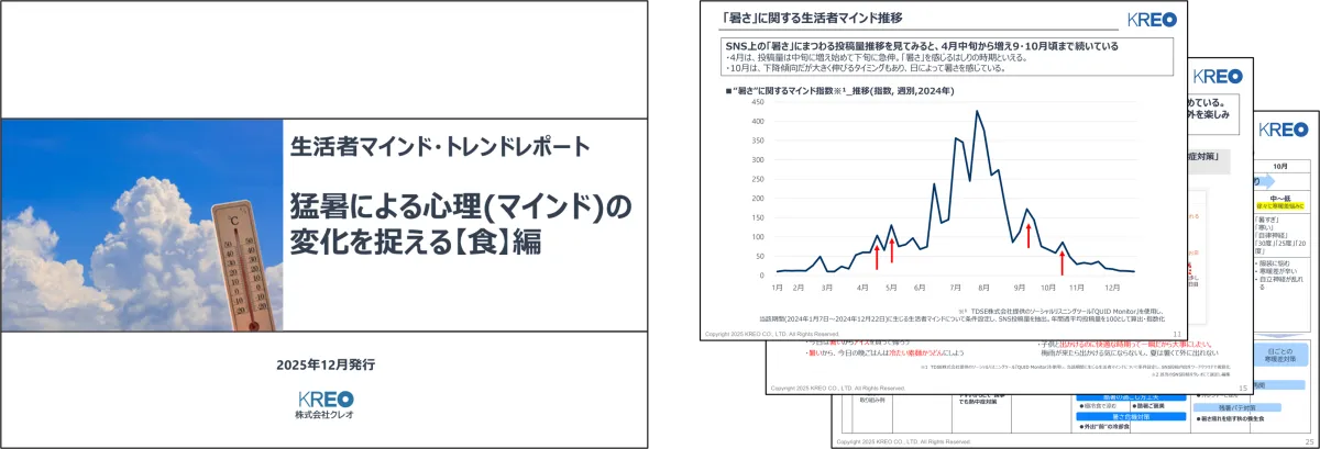 株式会社クレオは、2025年12月10日に新たなレポート『猛暑による心理(マインド)の変化を捉える【食】編』をリリースしました。このレポートは、厳しい暑さが生活者の心理や行動にどのように影響を与えているのかを分析したものです。特に、SNS投稿から得られるデータを基にし、夏の長期化や猛暑による生活者マインドの変化を可視化することを目的としています。
