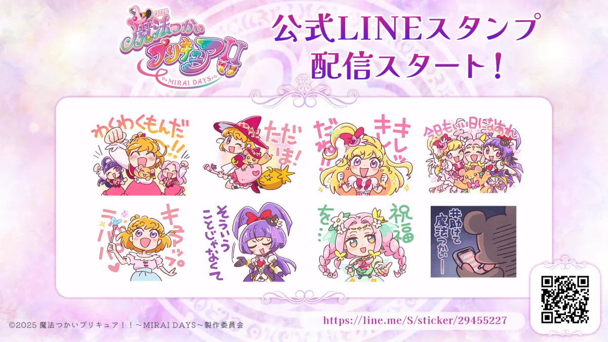 人気アニメ『魔法つかいプリキュア!!~MIRAI DAYS~』のLINEスタンプが遂に配信されました。このスタンプセットでは、アニメの名シーンやキャラクターたちのユニークなセリフを用いた全40種類のスタンプが揃い、ファンの皆様に楽しんでいただける内容となっています。スタンプは、こちらの