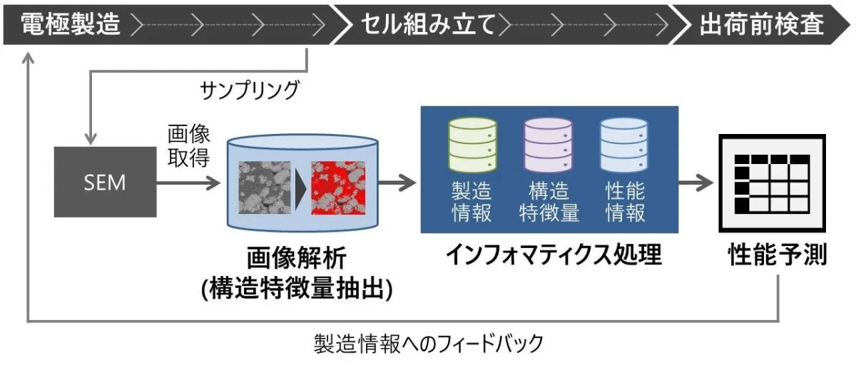 今回の開発では、電極シートの構造特徴量抽出技術が重要な役割を果たしています。この特性を用いることで、これまで製造時に集めなければならなかったデータ量を大幅に削減でき、精度を下げることなく、製造過程での性能を予測できます。また、SEM画像解析を活用し、製造工程中に生じる品質異常を早期に察知するための手法も確立されました。