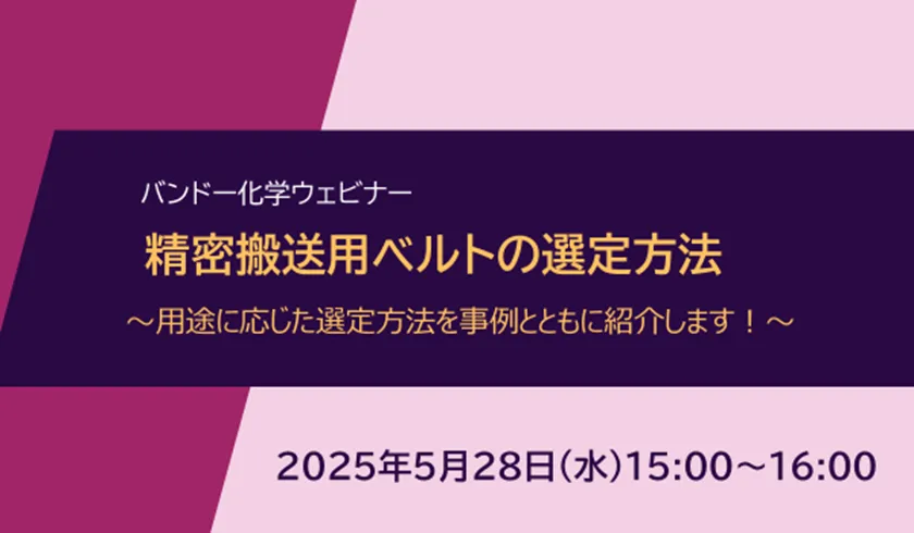 バンドー化学株式会社は、精密搬送用ベルトの選定に関するウェビナーを開催します。現代の製造業において、精密搬送用ベルトに対する要求は多様化しており、適切な選定がますます重要になっています。このウェビナーでは、それらの課題に対するアプローチをお伝えします。