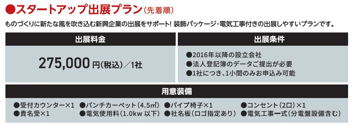 「スタートアッププラン」は先着順での受付となるため、条件を満たすスタートアップ企業は、ぜひこの機会を逃さずに出展を検討してください。