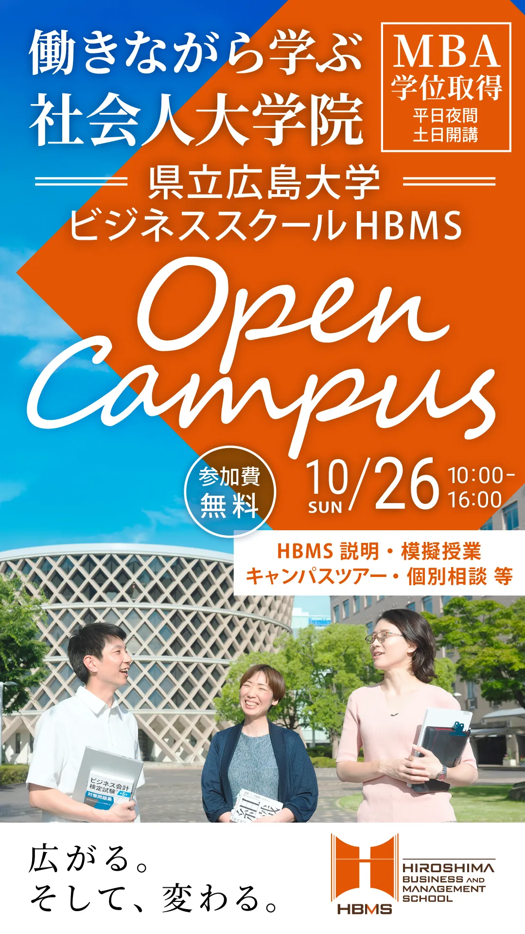 県立広島大学大学院経営管理研究科(HBMS)は、2025 HBMS OPEN CAMPUSを開催します。この機会は、働きながらMBA取得を目指す社会人にとって特別な体験の場となります。中国地方で唯一のビジネススクールという価値を持つHBMSでは、入試説明や模擬授業、個別相談会など多彩なプログラムが用意されています。