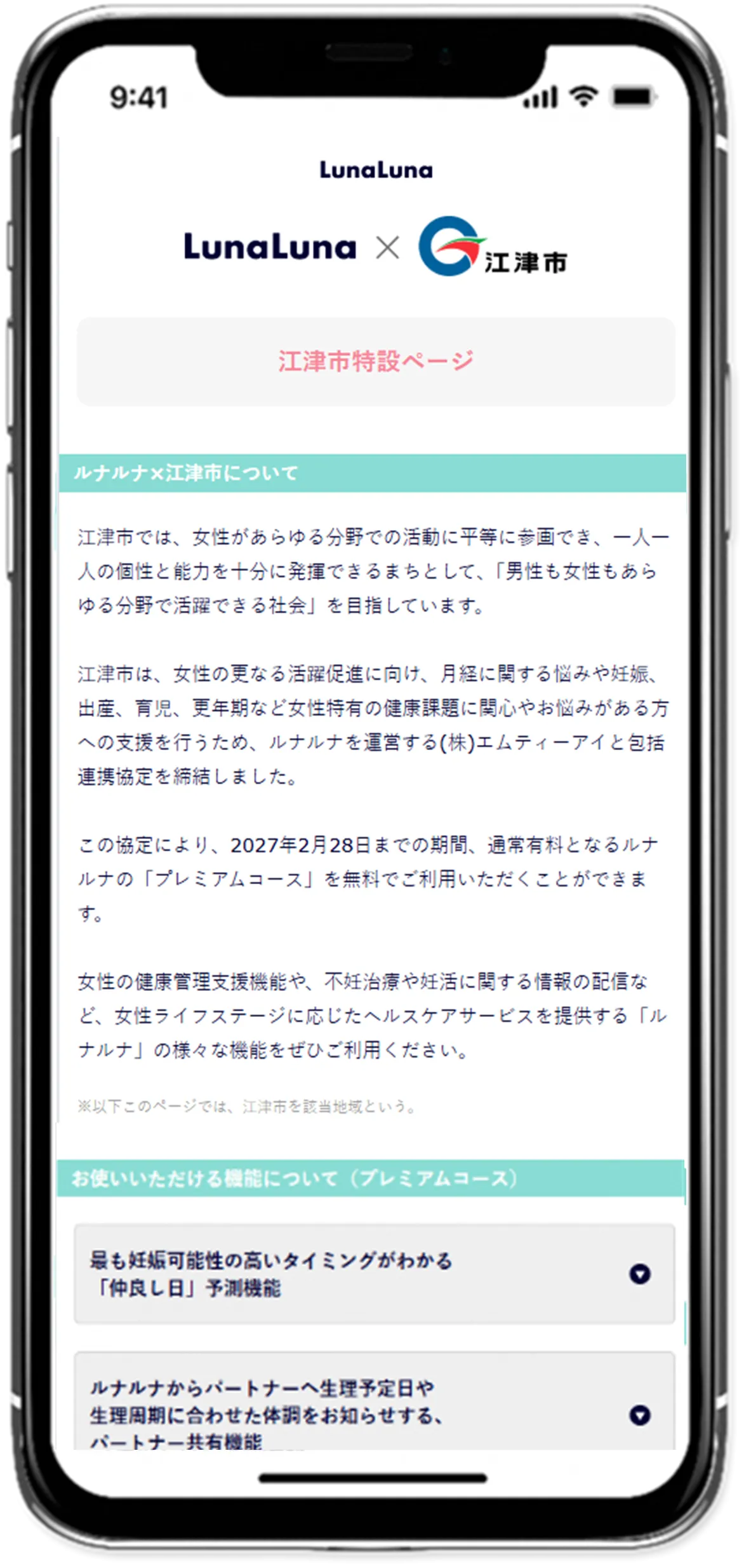 この連携協定によって、江津市の女性は、無償で『ルナルナ』の「プレミアムコース」が利用可能になります。具体的なサービス内容は下記の通りです。