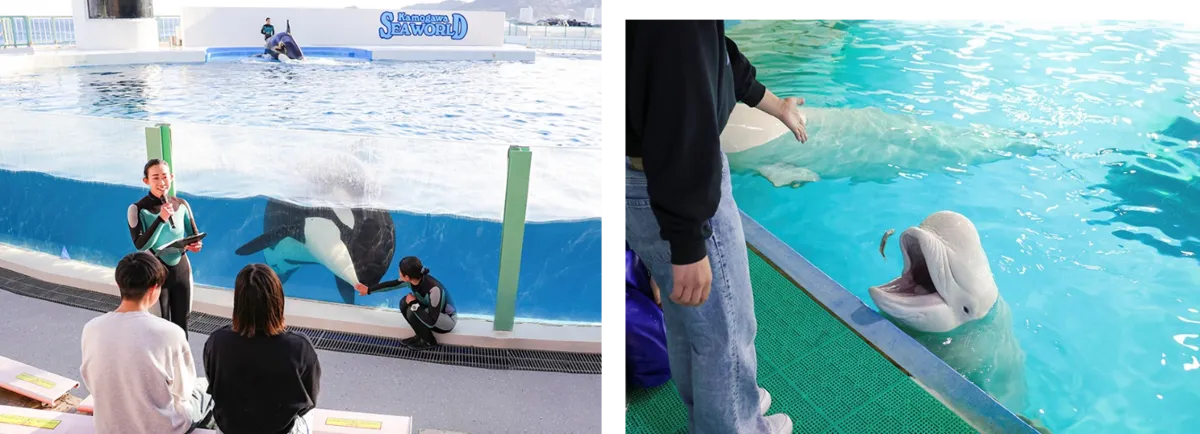 飼育員の解説付きでカマイルカの観察が行え、彼らの習性や生活について詳しく学びます。