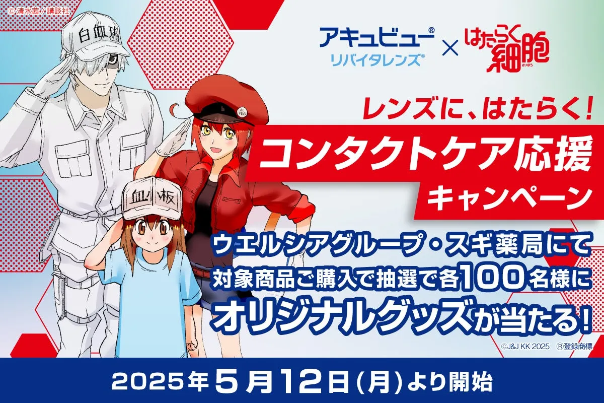 『はたらく細胞』は、細胞が擬人化され、身体の中での働きをユーモラスかつ感動的に描いた作品で、多くのファンに支持されています。ジョンソン・エンド・ジョンソンは、この作品のキャラクターたちが勇敢に病原菌と戦う様子と、自社製品の「アキュビュー® リバイタレンズ®」が提案する“クリアな視界と快適な着け心地”というコンセプトが合致すると考え、コラボレーションを実施しています。前回のキャンペーン同様、ファンにとって嬉しいプレゼントが期待されています。
