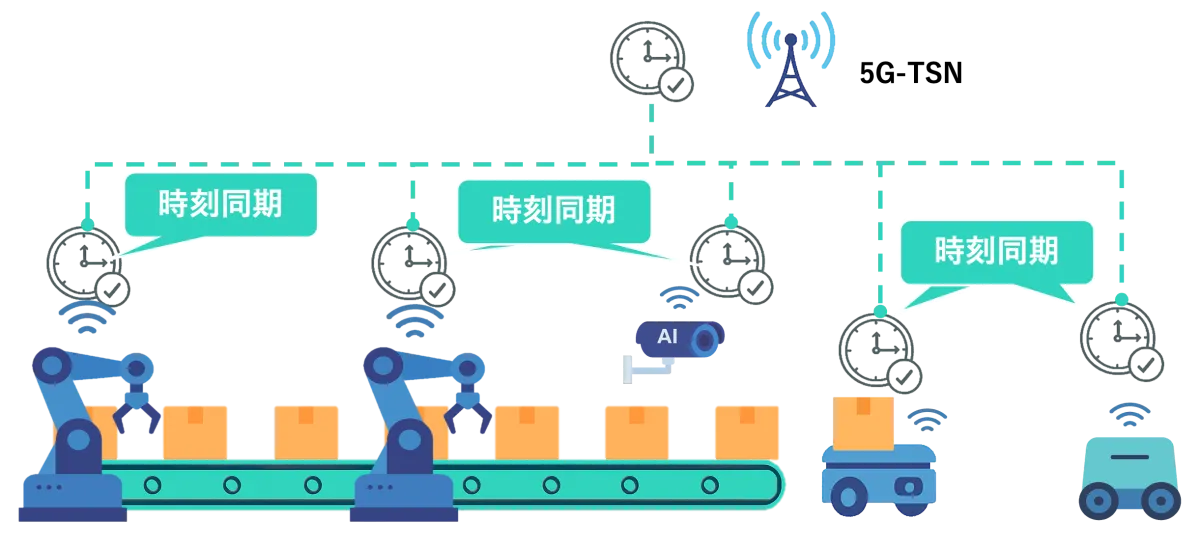 5G-TSNシステムは、工場内での産業機器をワイヤレスで接続し、1マイクロ秒以下の高精度時刻同期を実現することで、リアルタイムな協調制御を可能にします。これにより、完全にワイヤレスな工場環境が得られ、生産効率や省エネが同時に実現されるのです。