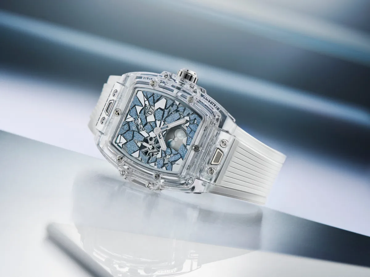 ウブロは2016年以来、サファイアクリスタルのケースを「ビッグ・バン ウニコ サファイア」の発表で進化させてきましたが、2026年はさらに革新を遂げる年です。この新作では、モース硬度9のサファイアクリスタルへの丁寧な加工と、ダイヤモンドのセッティングという極限の技術が融合しています。