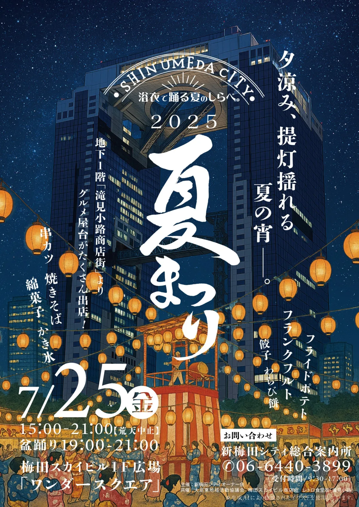 新梅田シティの夏祭りについての詳細や質問があれば、新梅田シティ総合案内所(TEL: 06-6440-3899)までお問い合わせください。対応時間は午前9時30分から午後5時までとなっています。