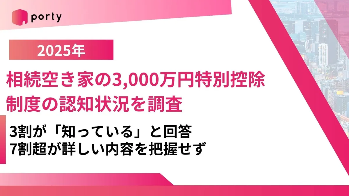 2025年、株式会社ポルティが実施した調査によると、相続空き家を扱うオーナーたちの間で「3,000万円特別控除制度」に対する認知度が非常に低いことが分かりました。全国の空き家オーナー200名を対象に行ったこの調査では、制度を「知っている」と答えた人はわずか29%で、7割以上がその詳細を理解していないという結果が浮き彫りになりました。