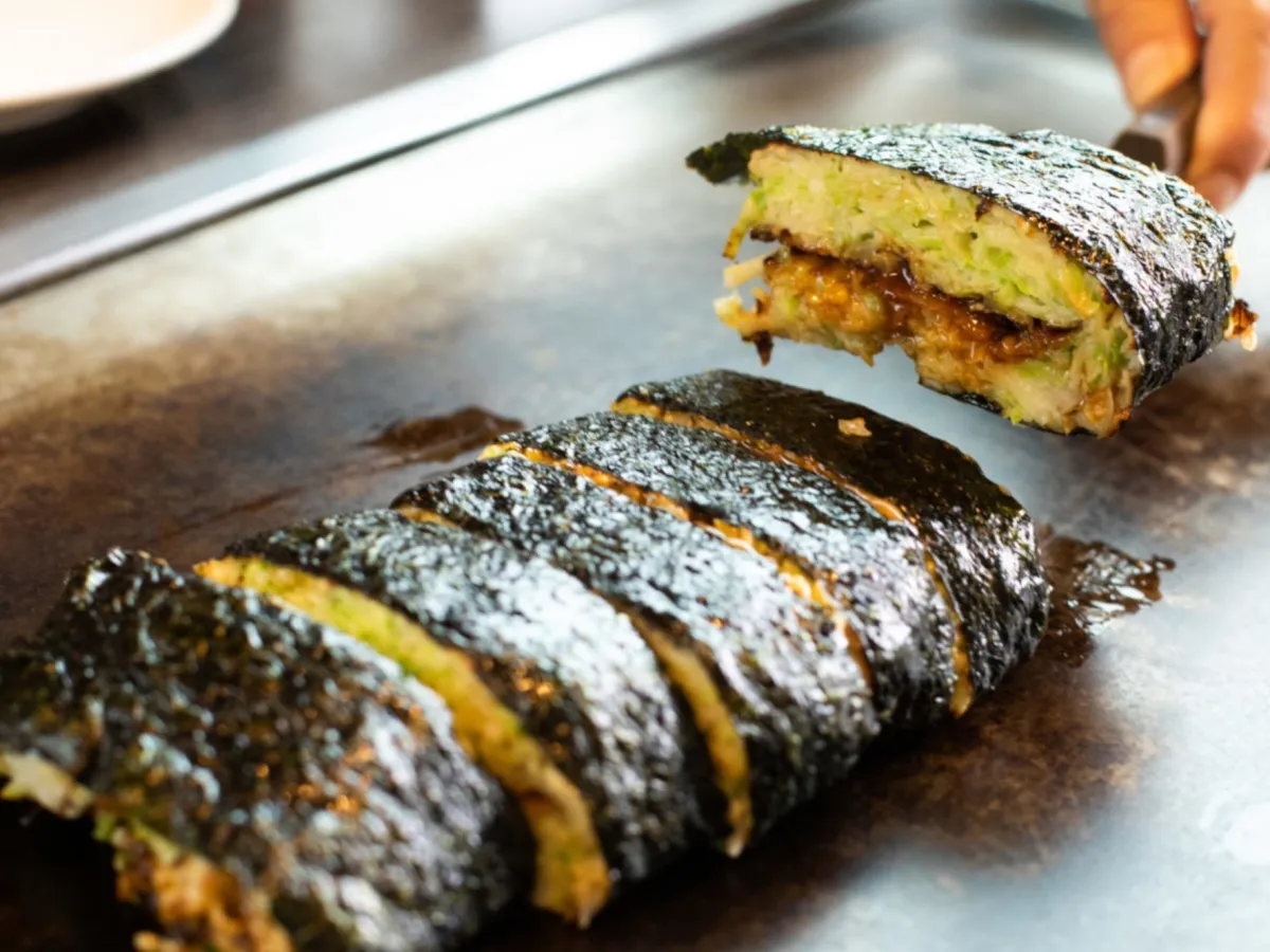 - - 独自の折りたたみ構造: 海苔で包まれた四角いお好み焼きを折りたたむことで、