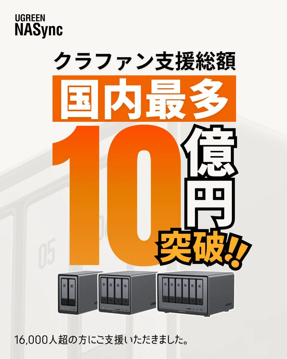 株式会社ユーグリーン・ジャパンは、2025年2月14日から5月1日まで行われた「UGREEN NASync DXPシリーズ」のクラウドファンディングにおいて、日本国内の支援金額の最高記録を更新しました。支援金額は10.5億円を超え、支援者数は16,800人を超えるという驚異的な成果を出しました。