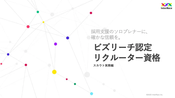 このような背景のもと、InterRaceは新たに「リクルーター資格スカウト実務編」を設立しました。この資格は、株式会社ビズリーチとの協力によって開発されており、ビズリーチのデータベースに基づいたスキルと知識を習得することができます。