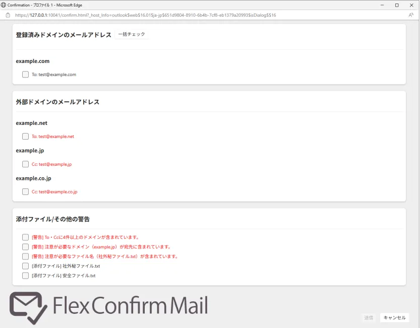 送信前に重要な項目(To、Cc、Bcc、添付ファイルなど)を検出し、自動的に確認画面を表示します。これにより、選択ミスに気づきやすくなります。