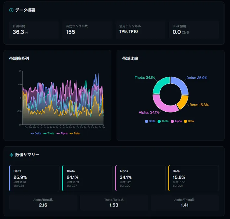 「脳波タイプ診断」は、ユーザーが脳波デバイスで取得したデータをCSVファイル形式でアップロードすることにより、Delta、Theta、Alpha、Betaの4つの脳波帯域を分析します。これにより、ユニークな思考パターンが四軸上に可視化され、16の異なる思考タイプとして結果が出力されます。このように科学的根拠に基づいた視点から自分の思考を理解することができるのです。