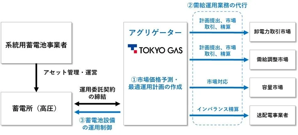 新サービスは、蓄電池を保有する事業者からの委託を受け、東京ガスがその蓄電池設備を運用する体制です。市場取引を通じて電力の需給調整や容量市場への参入を図り、収益の最大化を目指します。東京ガスが得意とする電力トレーディングにおける予測技術や運営のノウハウを活かすことで、効果的な運用が期待されています。また、その対象は高圧系統用に拡大し、特別高圧系統用のサービスの展開と併せて、より広範なニーズに応えることが可能です。