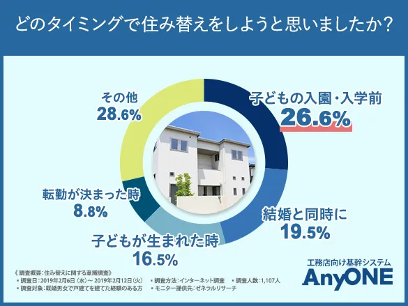 調査の結果、住み替えをしようと思ったタイミングの1位は「子どもの入園・入学前」で、全体の26.6%がこの選択をしています。次いで「結婚と同時に」が19.5%、そして「子どもが生まれた時」が16.5%と続きます。これは、家庭の環境や教育方針を考慮する上で、子どもの成長が主要なファクターであることを反映しています。