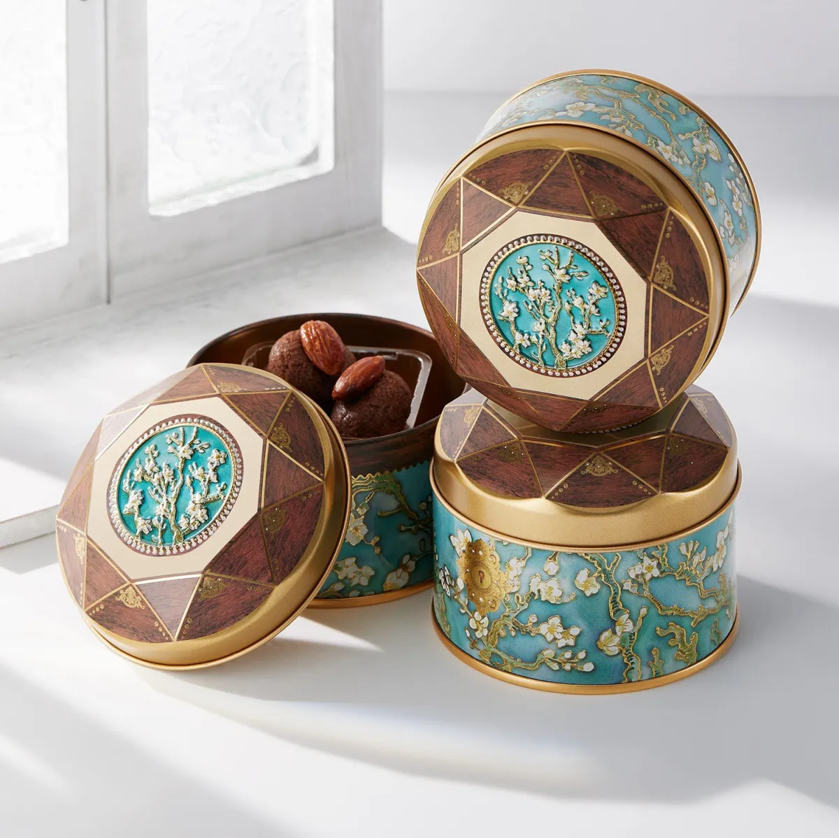 背景は映える水色で、花咲くアーモンドの木の枝が繊細なエンボス加工で立体的に表現されており、細部にわたる精緻さが際立っています。缶のデザインには、アンティーク風の鍵穴が配されており、まるで宝石箱を開けるようなわくわく感を提供します。