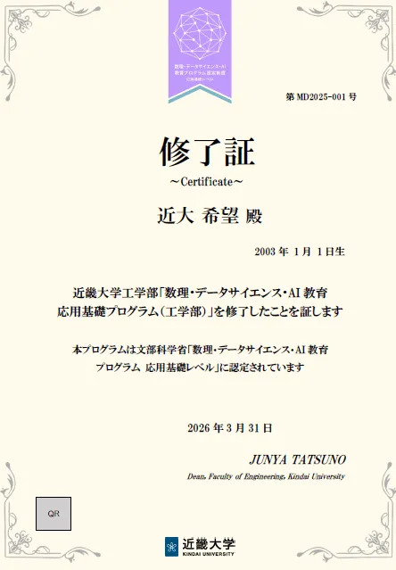 デジタル修了証の運用は令和8年(2026年)4月下旬を予定しており、令和7年度(2025年度)のプログラム修了者に対して発行が行われます。ただし、初年度の修了者45名については特例として前倒しで発行される予定です。