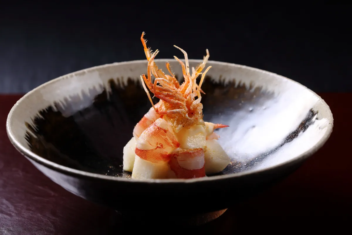 「先附醍醐和え」は、車海老を使った一品で、フランス料理でよく使われる技法を応用しています。油霜を用いて海老の甘みを引き立て、洋梨と酪を合わせた特製のジュレを添えています。また、土佐酢風味のジュレと砕いた海老の塩によって、さっぱりとした味わいながらも、海老の旨味を堪能できる一品に仕上げています。