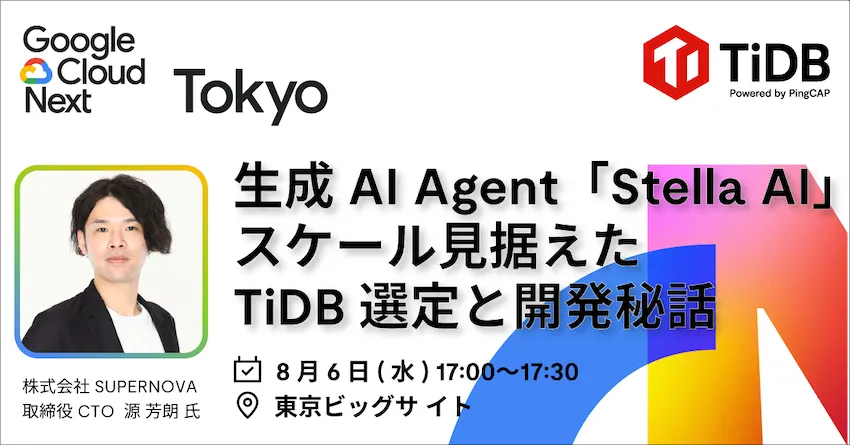 イベントでは、基調講演やライブセッション、展示、ハンズオンなどを通じて、実際にGoogle Cloudを導入・運用している企業の声も紹介されます。特に、セッションの中ではPingCAPが提供する「Stella AI」に関する開発秘話が取り上げられる予定で、参加者はこの生成AIエージェントの裏側や、データベースを用いたインフラストラクチャーの工夫を学ぶことができます。具体的には、2025年8月6日(水)17:00からのセッションでは、SUPERNOVA株式会社の取締役CTO源芳朗氏が登壇します。