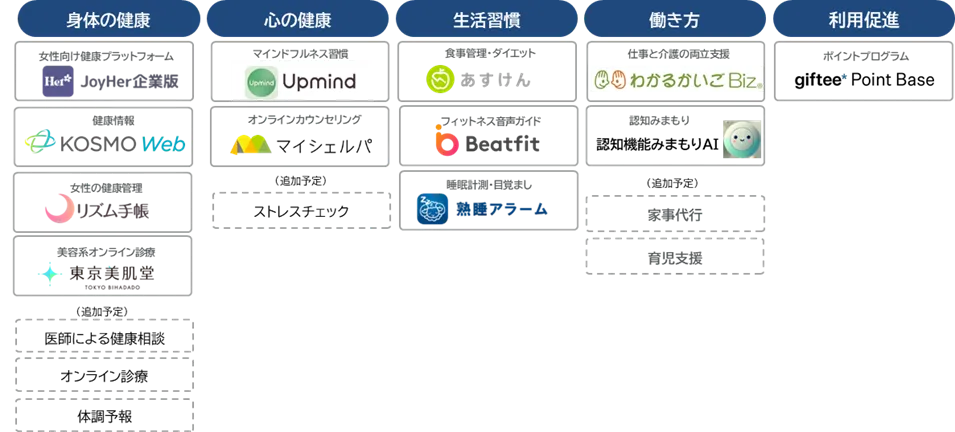 この「ハービット」は、ダイエット、フィットネス、メンタルケア、介護、さらにはフェムテック関連の優れたアプリやサービスを一元的に利用できるプラットフォームです。法人契約を通じて、契約を結んだ法人の従業員がこのサービスを活用できる仕組みとなっています。今後、育児支援や家事代行、オンライン診療などの新しいサービスも追加される予定で、多様なニーズに応える形で機能が拡充されていくとしています。