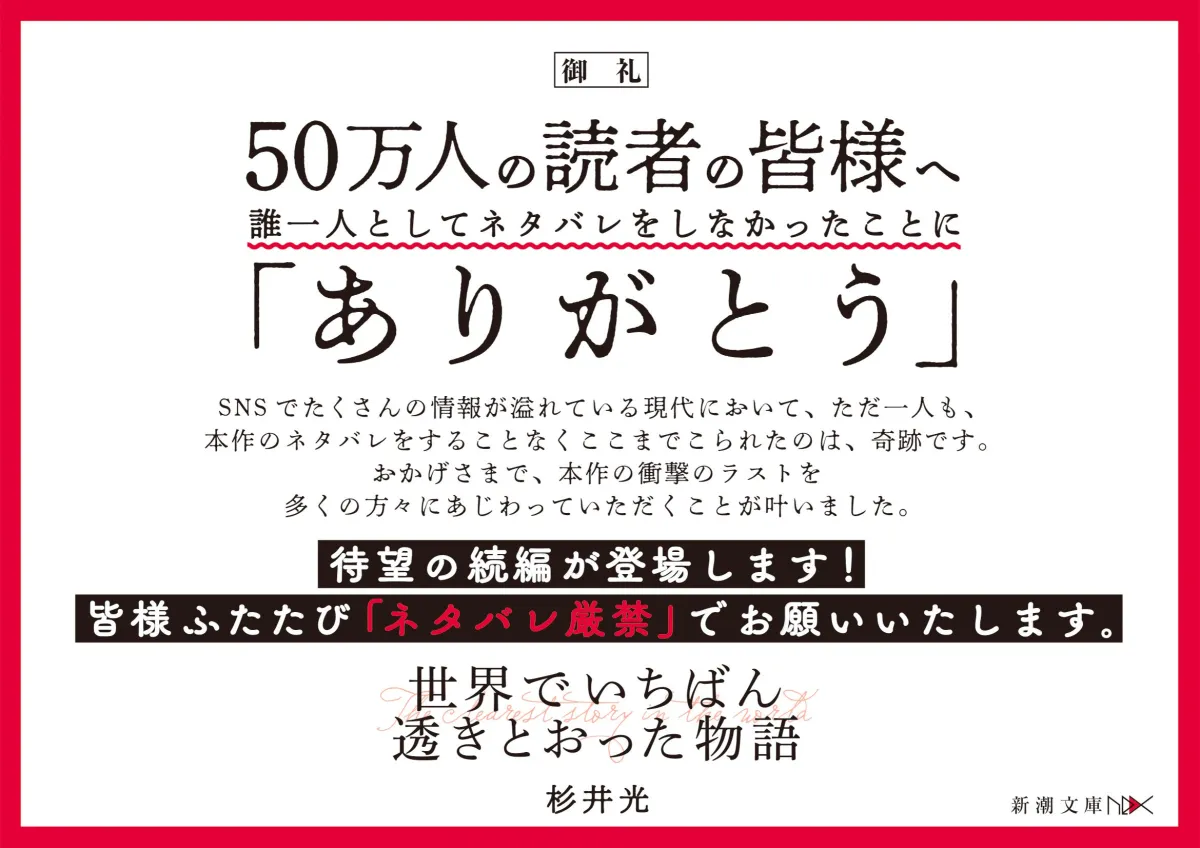 前作の人気を支えた読者に感謝の意を込めて、現在、全国書店では『世界でいちばん透きとおった物語』の感謝御礼フェアが開催中です。再度のネタバレ禁止ルールが強調されており、前作を共に読んだファン同士がその内容について語り合うことはできるものの、その詳細には踏み込まないという約束があります。また、続編に向けて同じように「ネタバレ厳禁」を守るよう呼びかけられています。