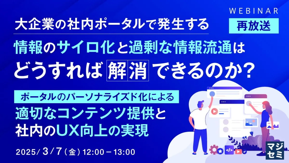 2025年1月21日に開催された「大企業の社内ポータルで発生する情報のサイロ化と過剰な情報流通はどうすれば解消できるのか?」というテーマのウェビナーが再放送されることになりました。この再放送は、多くのリクエストに応じて実現されたもので、企業の情報管理を効率化したい方々にとって、非常に貴重な機会です。