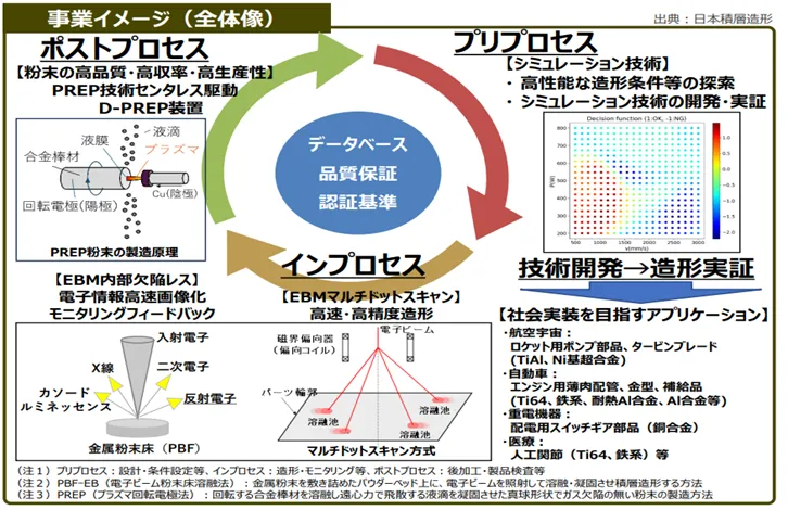 プロジェクト名は「全面統合型次世代金属積層造形技術の開発」であり、その目的は、新しいものづくりの基盤技術を確立することである。事業は2028年度まで続けられ、参加企業と連携して技術を進化させる。