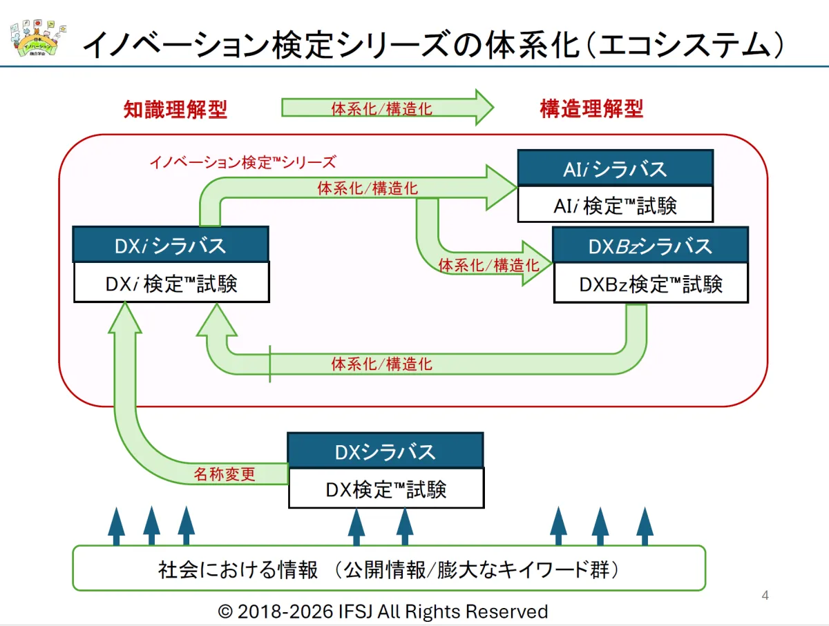 これまで、同学会は2018年からIT技術やビジネスの知識を問う『ITBT®検定』、2020年からはDX推進人材を対象とした『DX検定™』を実施してきました。しかし、AIエージェントの時代に突入し、AI活用が急速に広がる現在、より高度な思考力を求められる状況となっています。そこで、イノベーション検定シリーズを体系化し、2026年4月から新たに『DXイノベーション検定™(DXi検定™)』を開始、その後、『AIイノベーション検定™(AIi検定™)』を新設する運びとなりました。