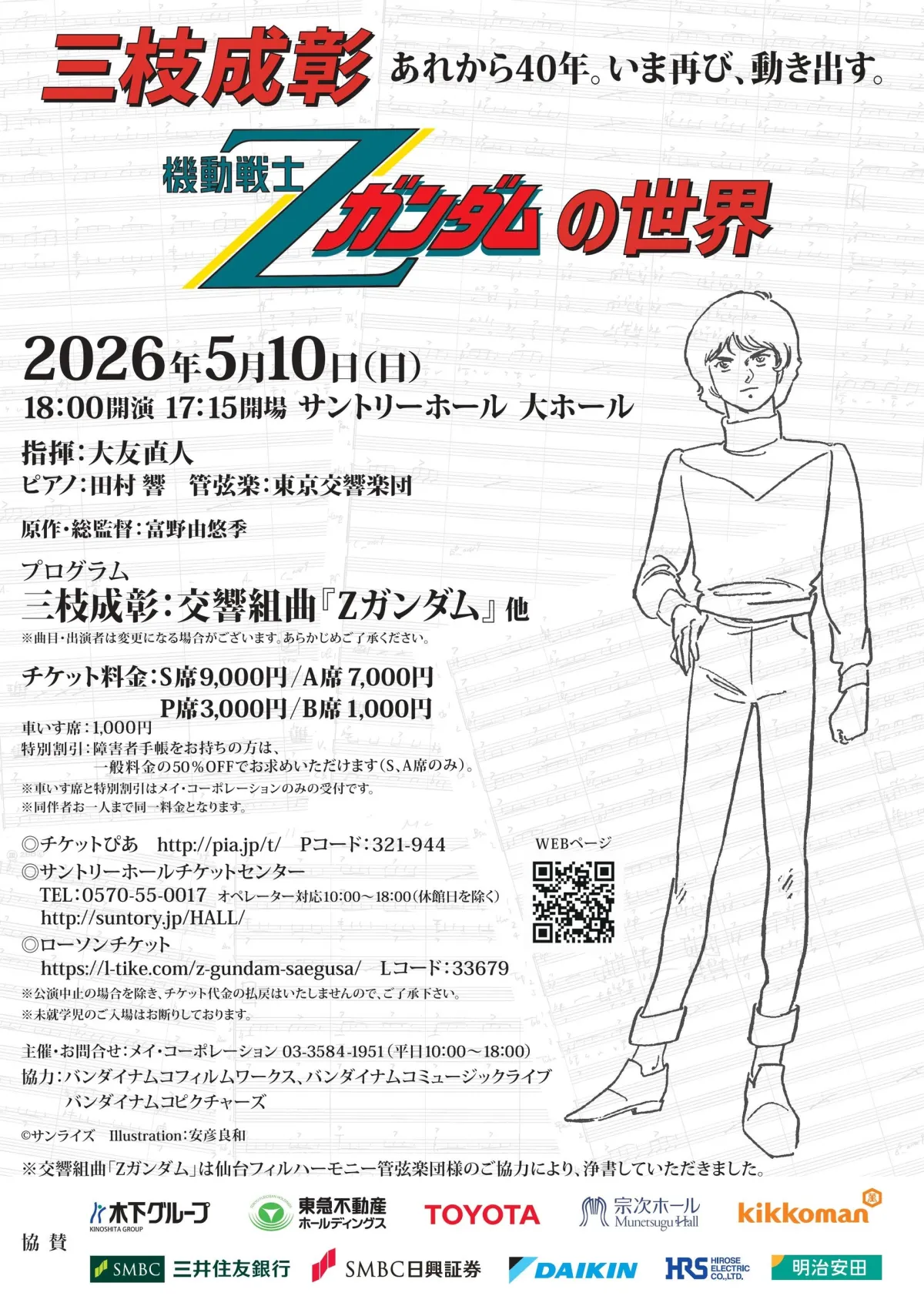 2026年5月10日(日)、東京のサントリーホールにて特別コンサート「三枝成彰 機動戦士Zガンダムの世界」が開催されます。アニメ「機動戦士ガンダム」シリーズのファンにはたまらない、魅力的なプログラムが詰まった公演です。