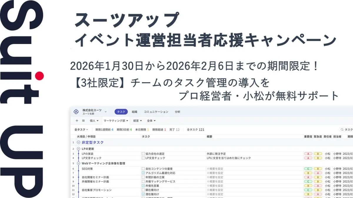 株式会社スーツが提供するAIタスク管理ツール「スーツアップ」が、イベント運営担当者向けに特別なキャンペーンを開始します。このキャンペーンは、中小企業やスタートアップを支援することを目的としており、指定の期間内に応募したイベント運営担当者の中から3社限定で、月額利用料が3ヶ月間無料になるというものです。