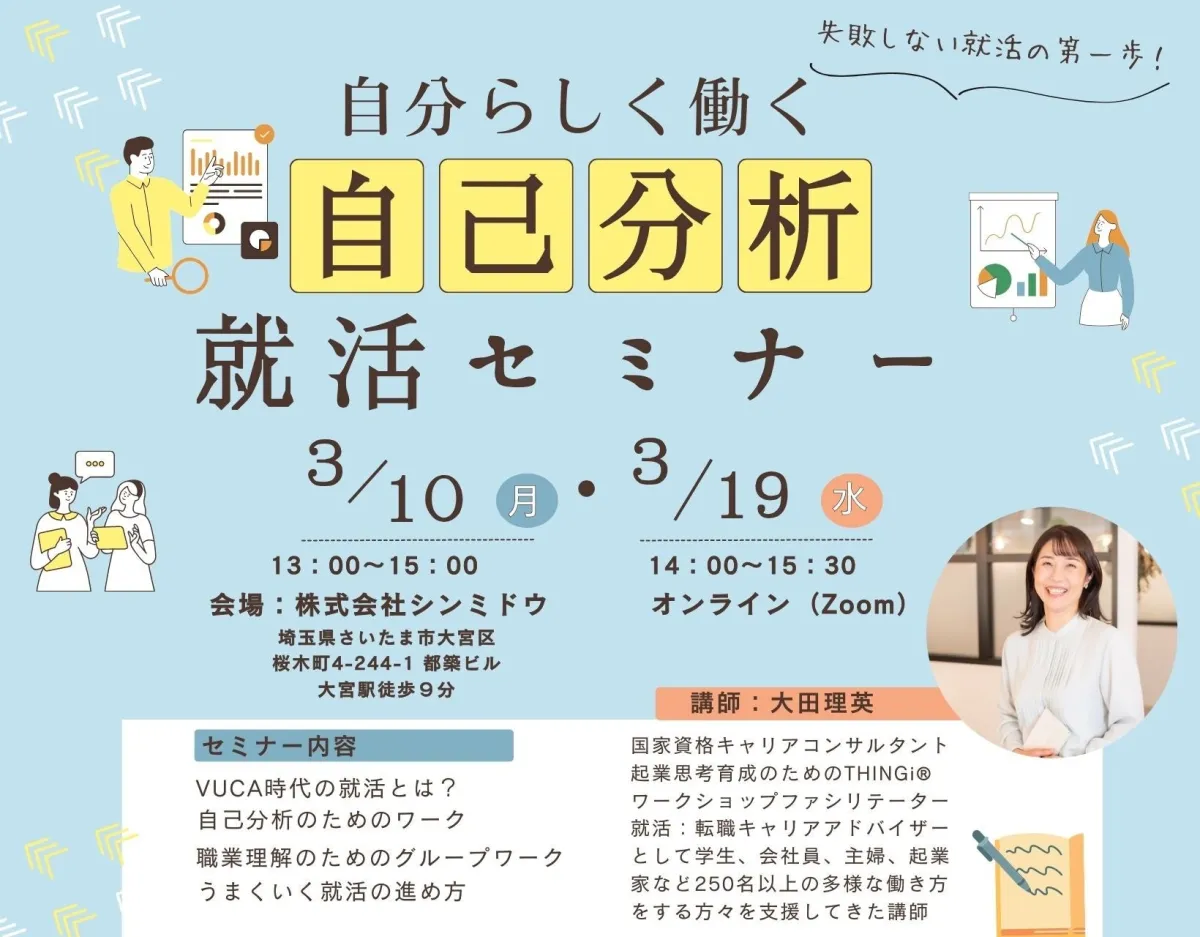 セミナーの講師を務めるのは、株式会社シンミドウの大田理英氏です。自己分析の専門家として数多くの学生をサポートしてきた経験を持ち、親しみやすく、かつ実践的なアドバイスで自信を持って次のステップへ進むための手助けをしてくれます。