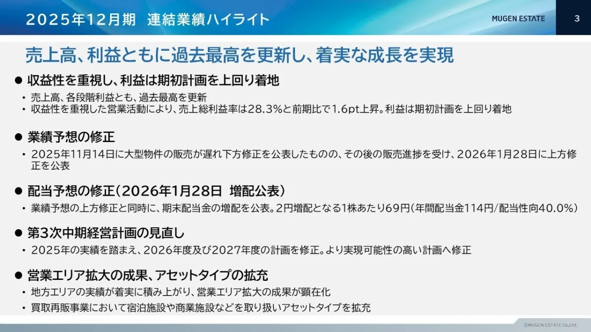 また、ムゲンエステートでは第3次中期経営計画の見直しについても触れています。計画そのものに大きな変更はないものの、2025年の実績を考慮して、2026年及び2027年の数値計画を実現可能性の高いものに修正する意向を示しています。これにより、株主への利益還元も一層手厚くなりそうです。