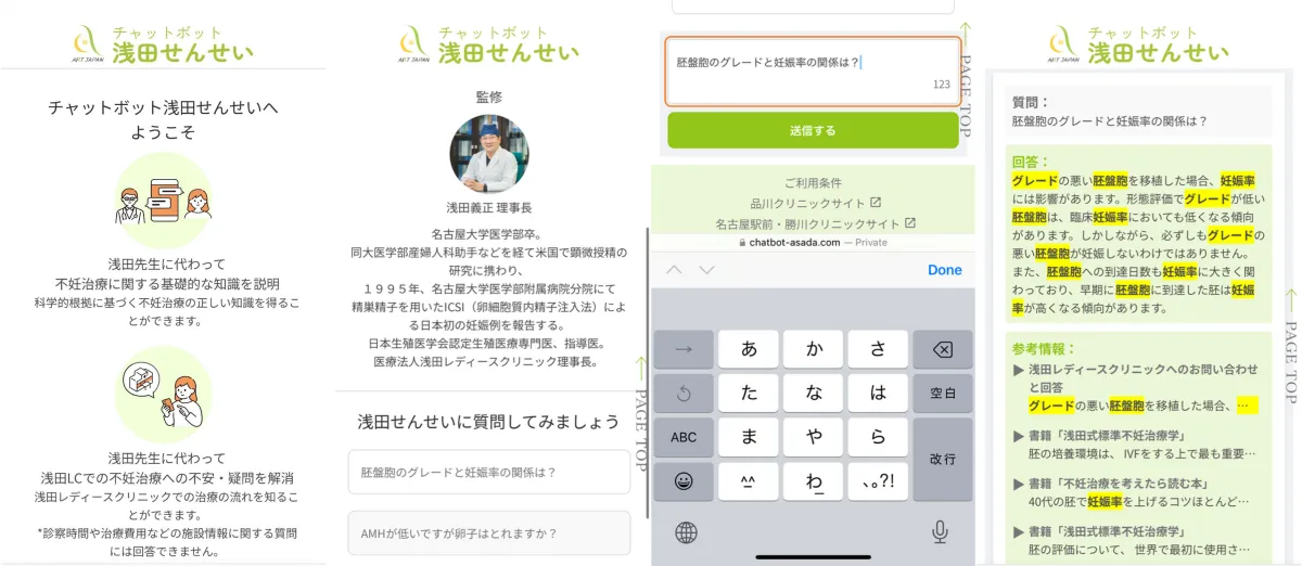 このチャットボットは無料で誰でも利用可能で、ユーザーは気軽に不妊治療に関連する疑問を投げかけることができます。回答内容には、浅田理事長が監修した情報が基づいているため、信頼性も十分です。また、ユーザーが得た情報の根拠となる参照情報が示されることで、一層の安心感を提供しています。