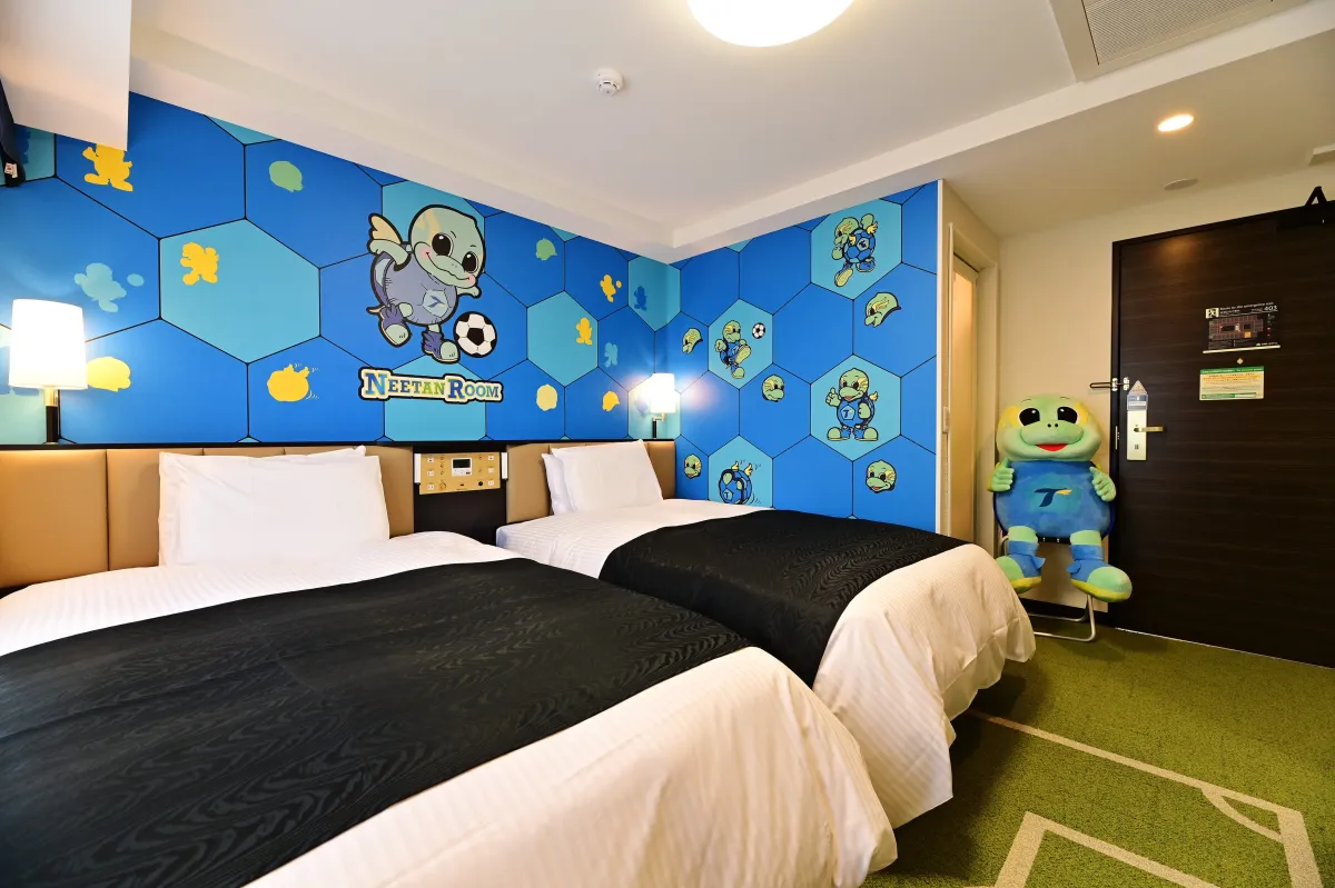 「ニータンルーム」のデザインには、ニータンの愛らしさを存分に取り入れた工夫が盛り込まれています。入室した瞬間、壁一面に描かれた大きなニータンが目を引き、その世界観に引き込まれます。特別設計のカーペットは、サッカースタジアムのピッチを思わせるデザインで、訪れたゲストに臨場感を提供します。