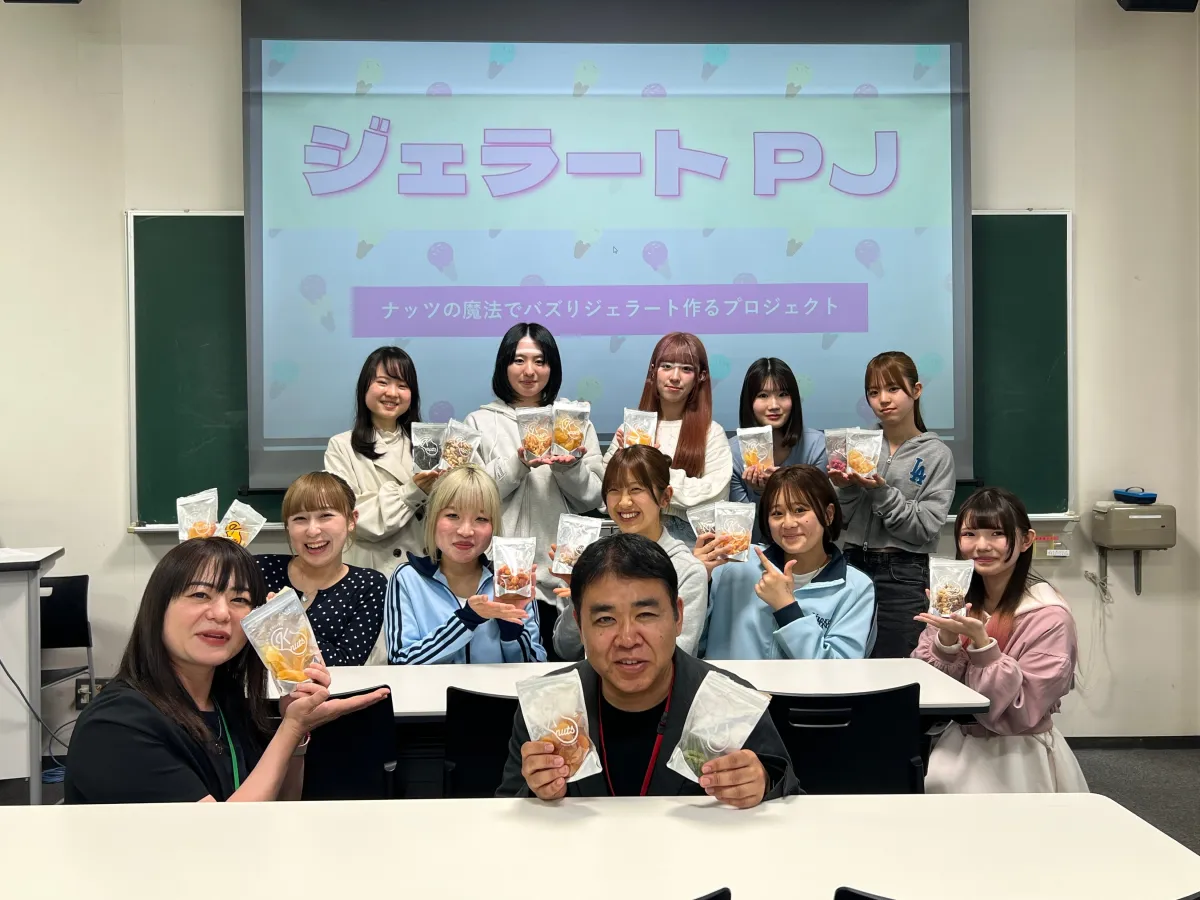 本プロジェクトは、ナッツとドライフルーツを専門とするブランド「K-nuts(金鶴食品製菓)」と、全国的に評価されている「ハスキージェラート(ロストアンドファウンド)」との連携によって実現しています。この2つの企業とのコラボレーションにより、学生たちはスイーツづくりの現場に直結した貴重な経験を積むことができました。