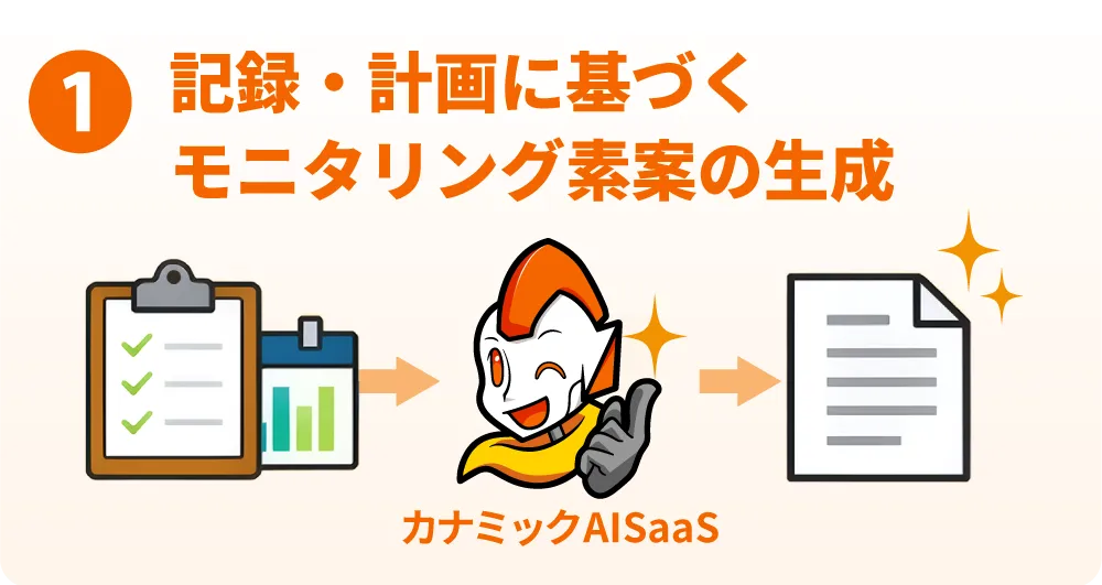 これらの課題を解決すべく、当社は「AI訪問介護モニタリング作成支援」機能を開発しました。これにより、モニタリング業務の目的を損なうことなく、書類作成の手間を軽減します。