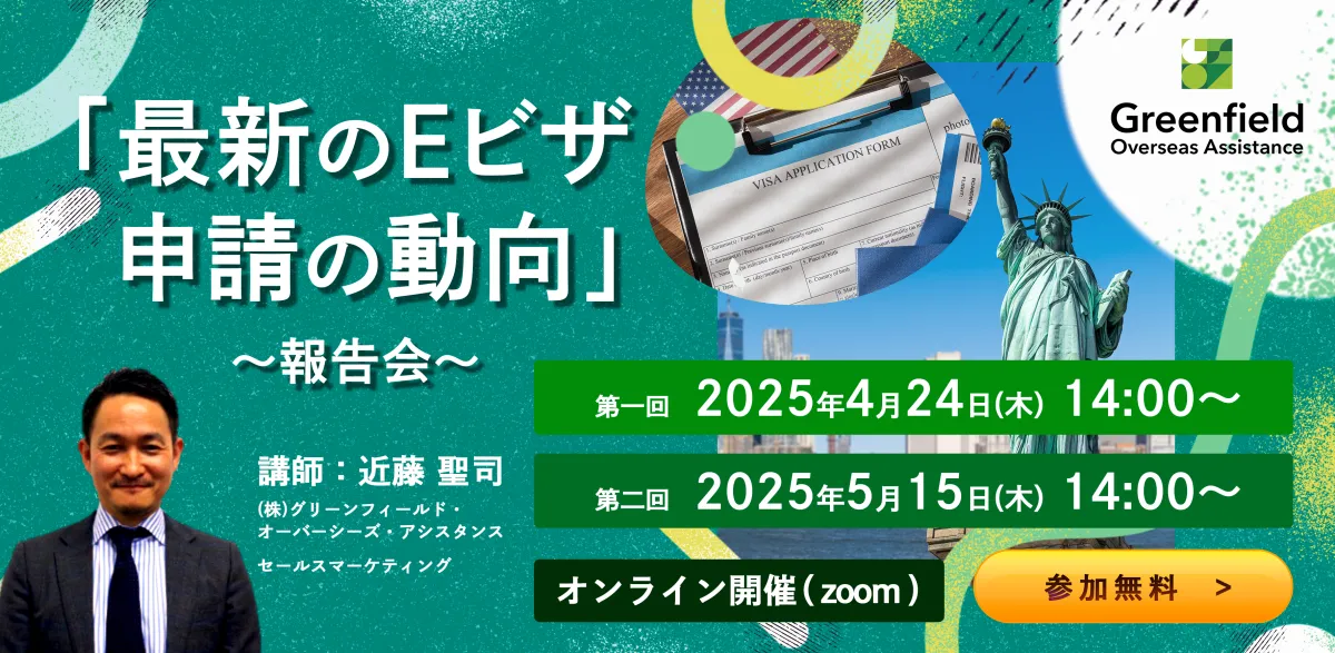2025年4月と5月の二回にわたり、株式会社グリーンフィールド・オーバーシーズ・アシスタンスが主催する「最新のEビザ申請の動向」をテーマにした無料オンラインセミナーが開催されます。このセミナーは、特にアメリカへの進出を予定している企業やビジネスパーソンにとって、見逃せない内容が用意されています。